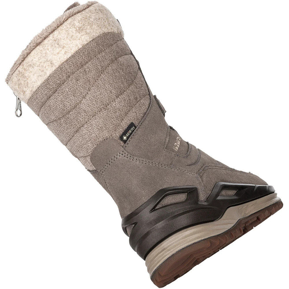 Ein klassischer Winterschuh im Look eines Freizeitschuhs? Wie funktional solch ein Widerspruch in Einklang gebracht werden kann, stellt der BARINA EVO GTX Ws beeindruckend unter Beweis. Denn mit seinem bis zur Wade reichenden Schaft, dem abgesteppten Kragen in Felloptik und den zahlreichen Prägungen kommt der Winterboot ziemlich modisch daher. Während innen eine wasserdichte GORE-TEX Membran mit Warmfutter für ein dauerhaft angenehmes Fußklima sorgt, wappnet außen ein hochwertiger Materialmix aus robustem Spaltleder und modisch abgesteppten Canvas- und Tweed-Einsätzen für nasskalte Bedingungen. Auch der Einstieg gelingt dank seitlich platziertem Reißverschluss schnell und bequem. Abgerundet wird das alles durch die griffige Gummilaufsohle, die mit ihrem multidirektional angeordneten Stollenprofil und Lamellen im Antrittsbereich punktet.